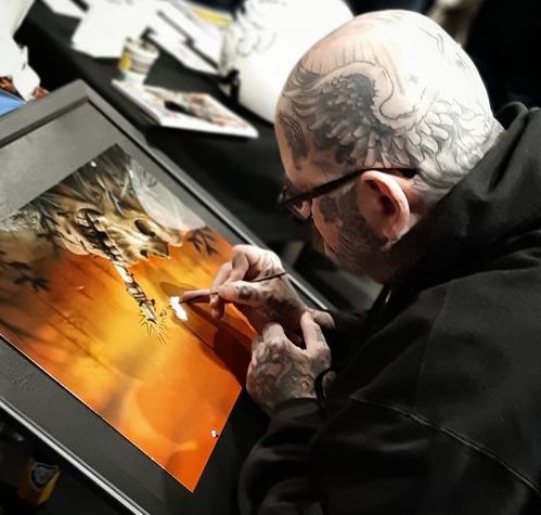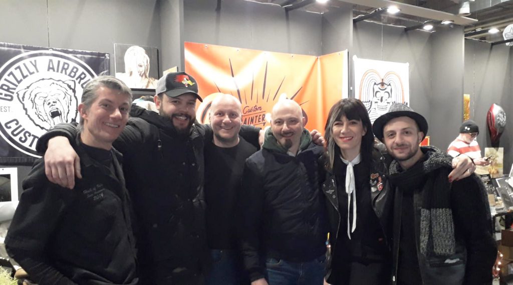 Inoltre, il Tutor Aka : Davide Salvadori “Grizzly Airbrush” ha realizzato un fantastico quadro a quattro mani, con l’Artista Internazionale : Darren McKeag ed ha realizzato le divise delle ragazze del Motor Bike Expo 2023.
