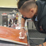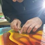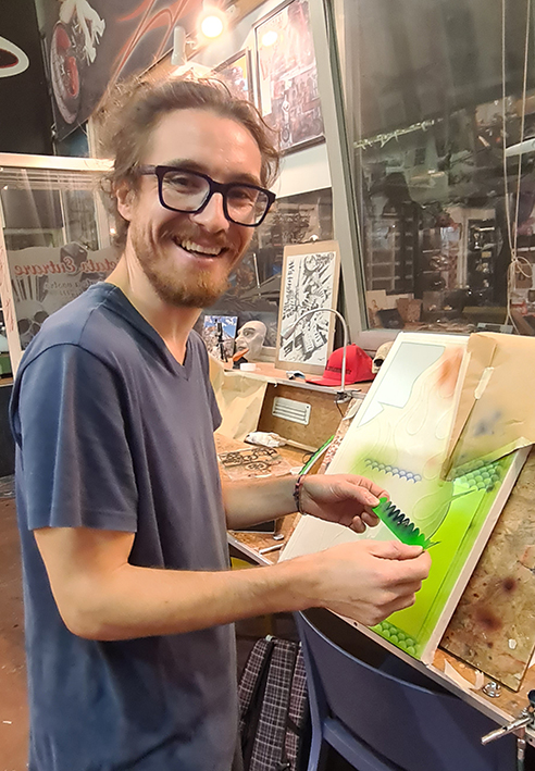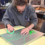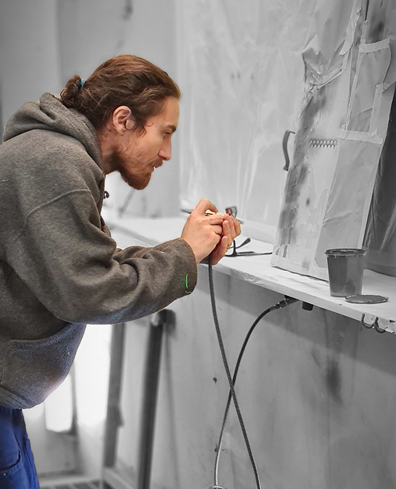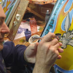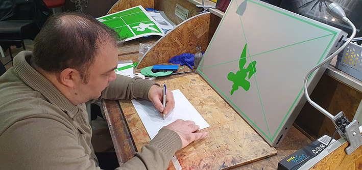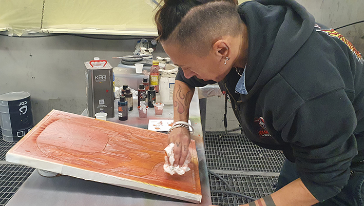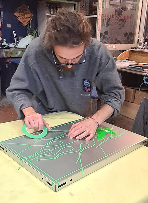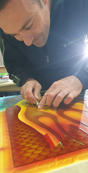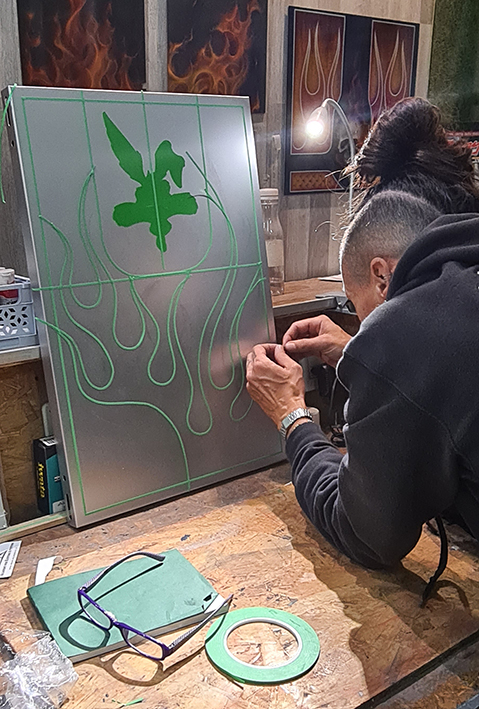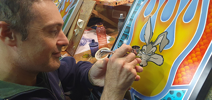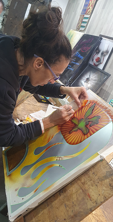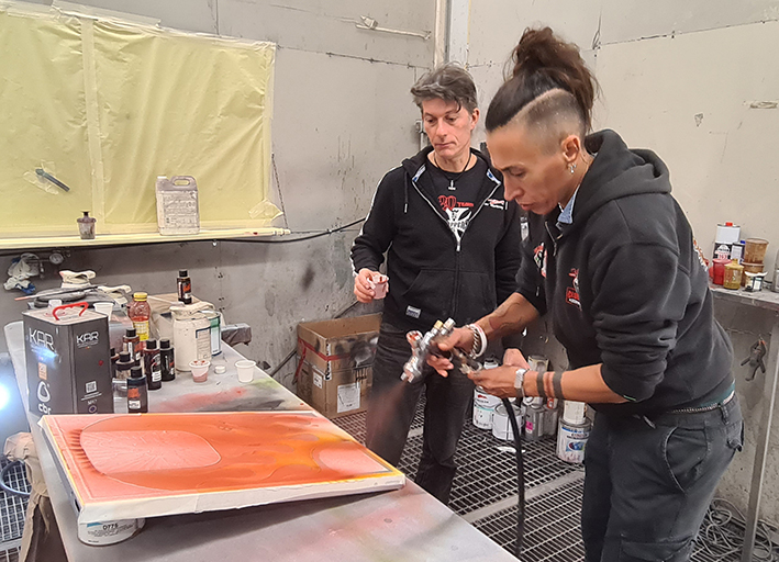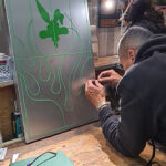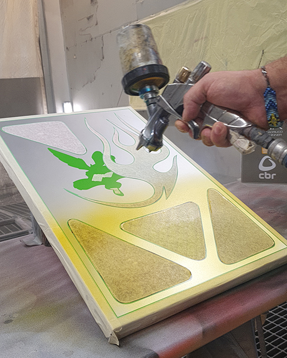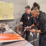 Nei giorni dedicati al Custom Painting, hanno posizionato la mascotte del corso (Willy il coyote) a loro piacimento sul pannello ed hanno iniziato, con l’uso dei nastrini, a tracciare le fiamme ed a tracciare le varie campiture, che poi sono state a loro volta riempite con varie verniciature ed effetti particolari.